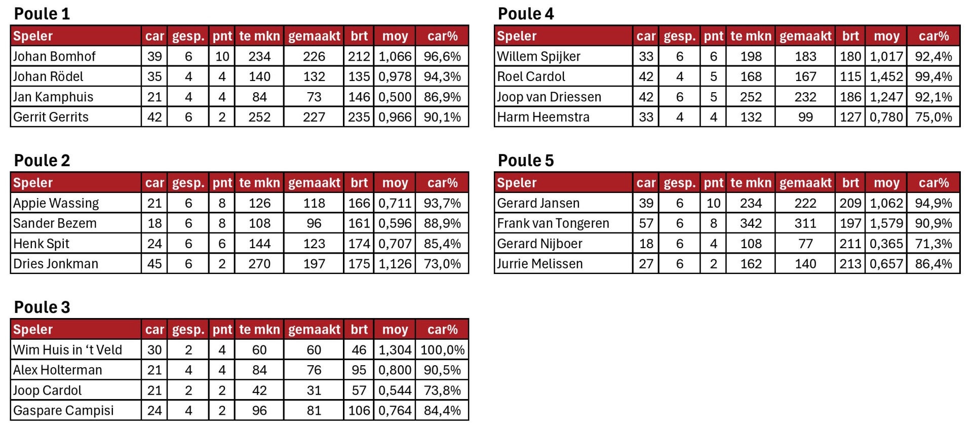 Maar bovenaan in de poule betekent niet automatisch plaatsing voor de finale. Omdat voor de definitieve ranglijst ook het 'carambole-percentage' een rol speelt, zal het spannend blijven totdat de laatste partij is gespeeld.
