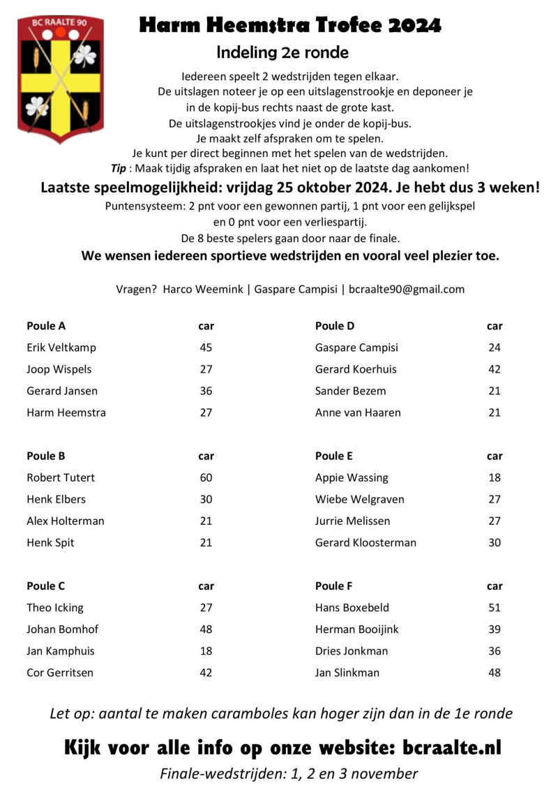 - een mail met je naam, telefoonnummer, e-mailadres en speelsterkte (libre gemiddelde als je nog niet eerder hebt meegedaan) aan bcraalte90@gmail.com te sturen, of