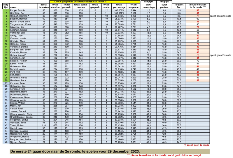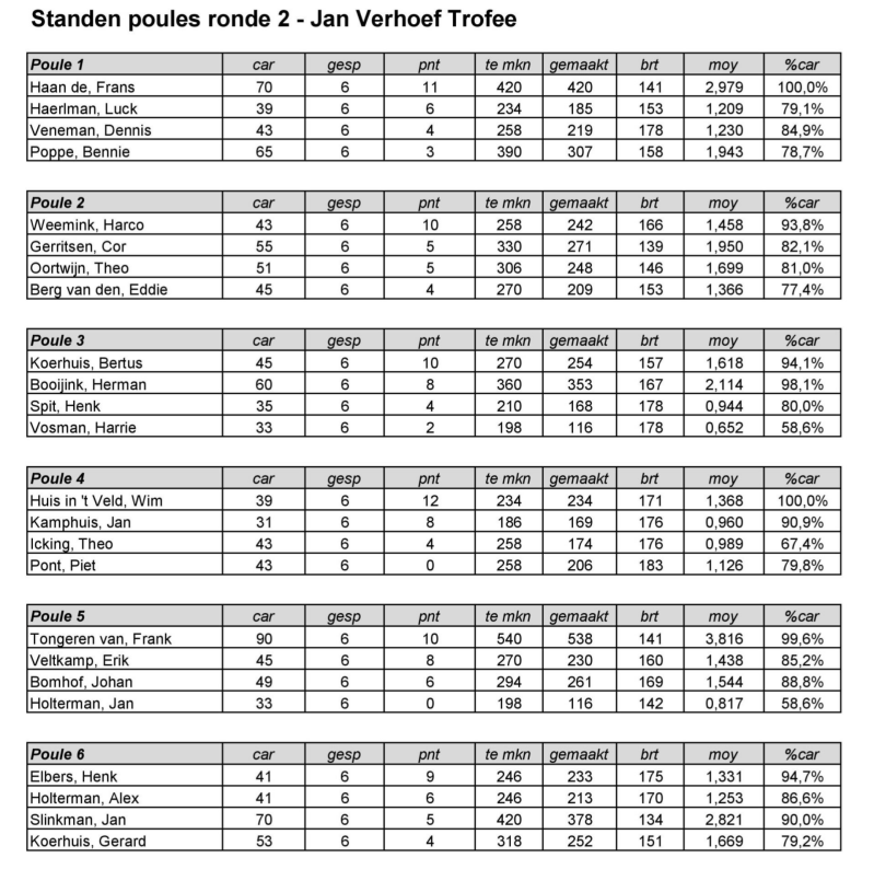 Eindstand per poule - ronde 2